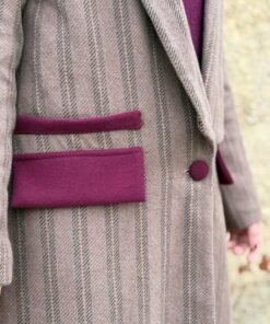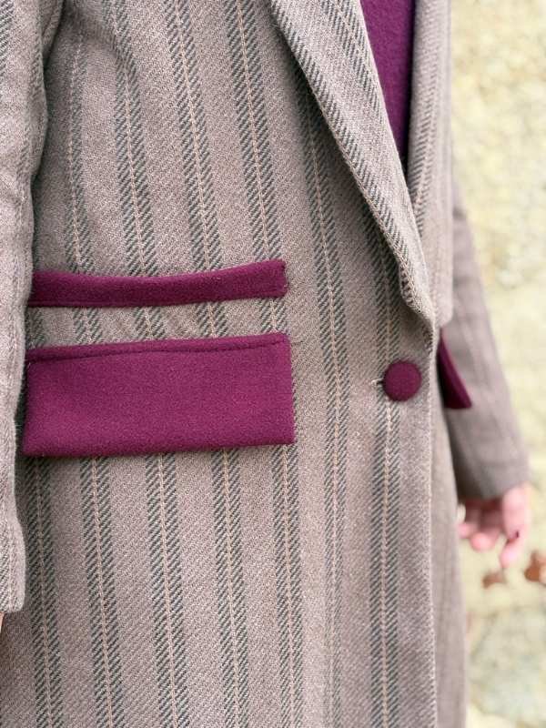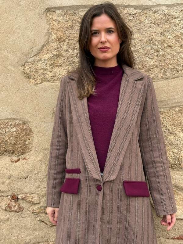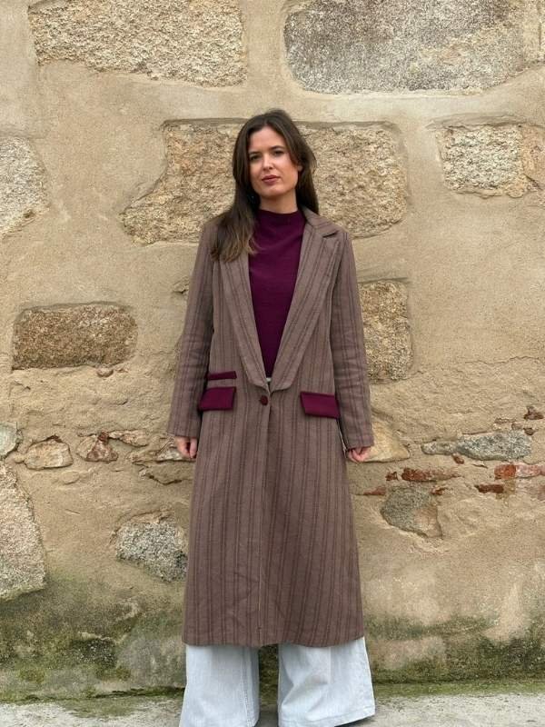 Los bolsillos y botones forrados en terciopelo burdeos añaden contraste y textura, elevando el diseño y aportando carácter sin perder equilibrio. La combinación de tonos beige, gris y burdeos resulta armónica y muy fácil de integrar en distintos looks, desde los más diarios hasta los más cuidados.