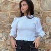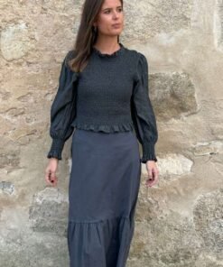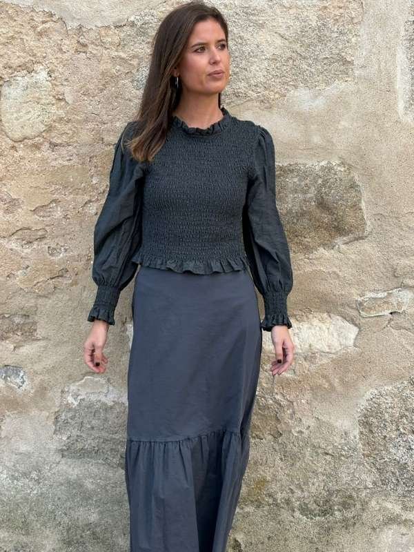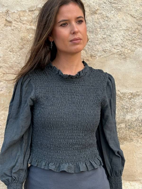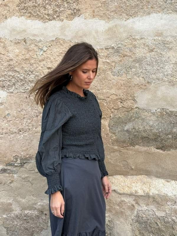 Blusa antracita con cuerpo nido de abeja, mangas lisas y cuello con volante. Se adapta y favorece. Romántica y versátil.
