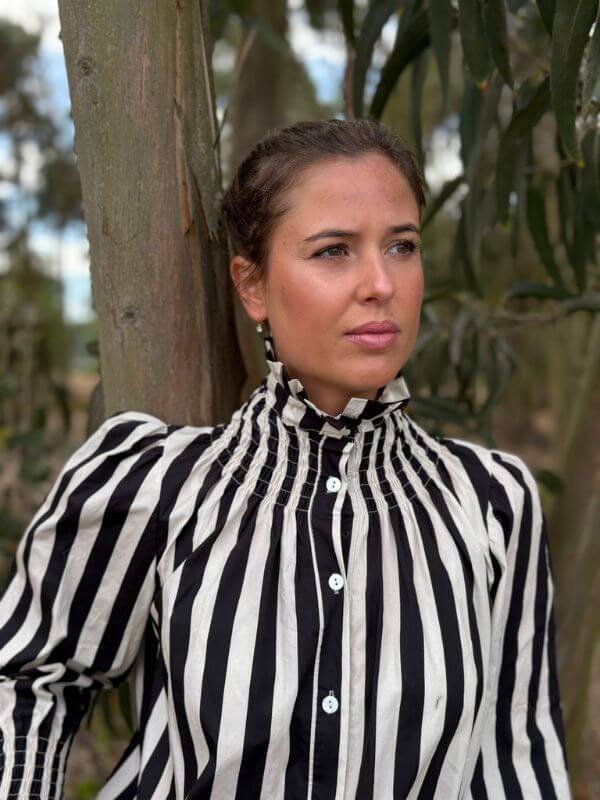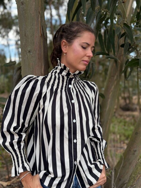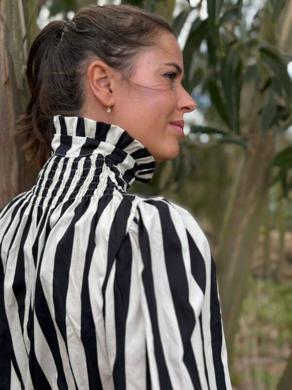 La Blusa Aurora de ZEN es sinónimo de elegancia contemporánea. Con rayas en blanco y negro, cuello alto fruncido y hombros ligeramente abullonados, aporta un estilo sofisticado con un aire juvenil. Una prenda versátil que combina comodidad y tendencia, ideal para looks tanto casuales como más formales.