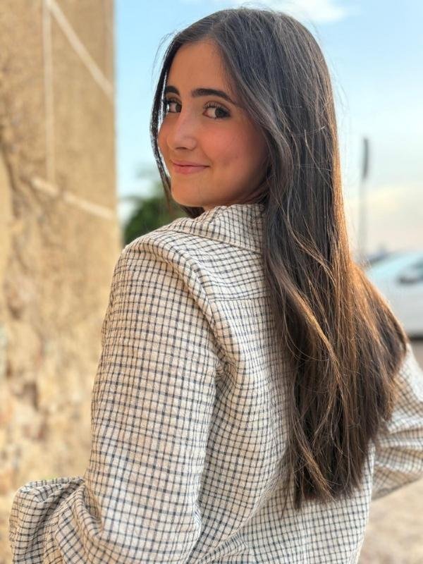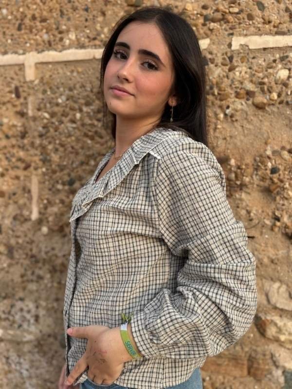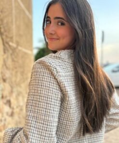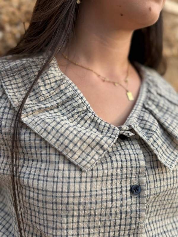 Blusa Eva de cuadros en marino, con escote en pico y volante. Femenina, favorecedora y muy combinable.