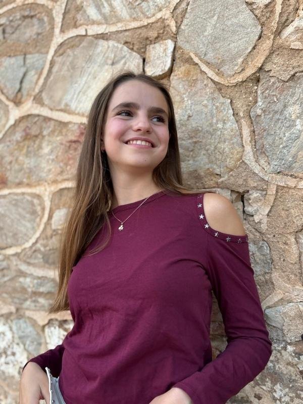 Camiseta de algodón con hombros descubiertos y estrellas en hombro y manga. Femenina, cómoda y con personalidad. Disponible en beis, burdeos y marrón.