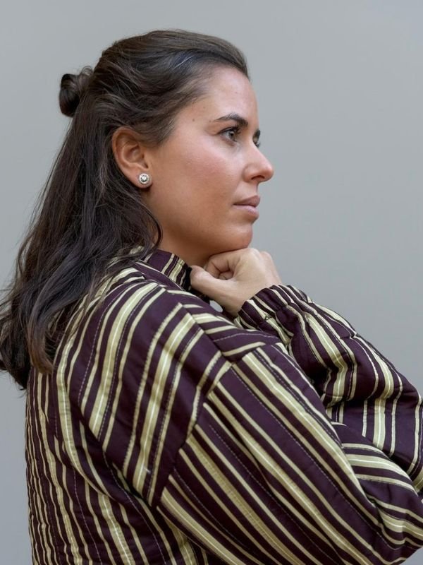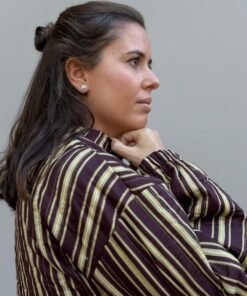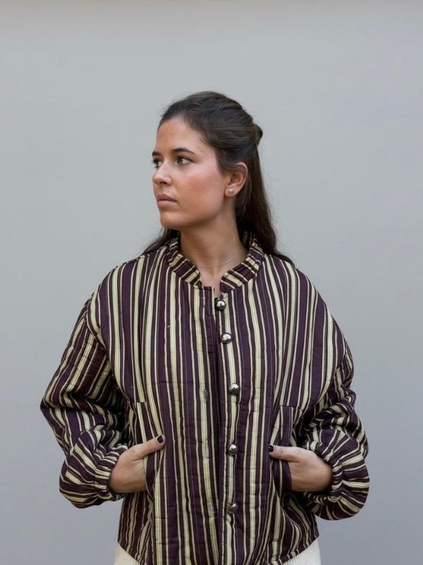 Chaqueta acolchada marrón con rayas lima, ligera, cálida y llena de estilo. Perfecta para combinar con jeans o looks más formales, aportando un toque moderno y sofisticado.