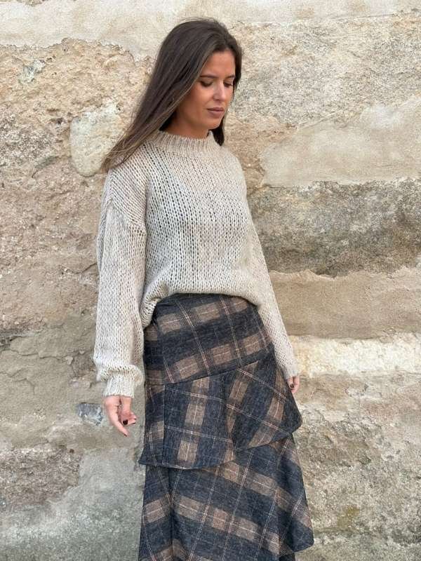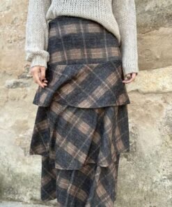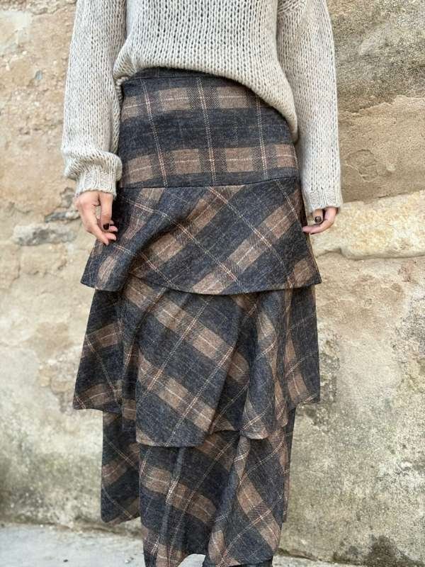 Falda larga de cuadros en grises y tostados, con tres volantes y cintura elástica. Caída fluida, cómoda y favorecedora.
