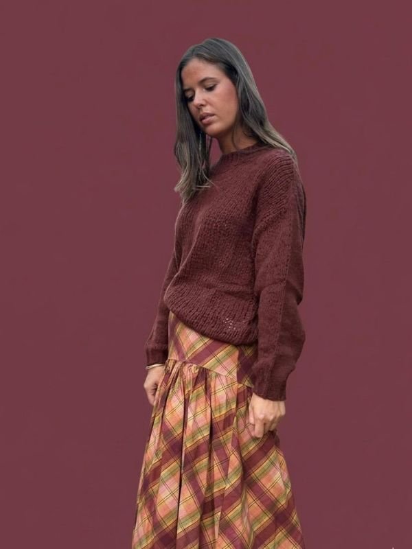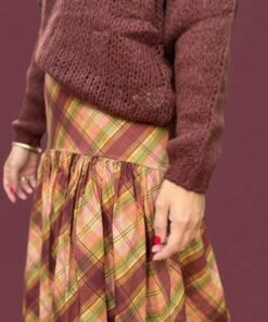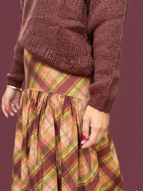 Falda de cuadros en burdeos, beige y verde con volante. Suave, femenina y con movimiento.Cintura elástica.
