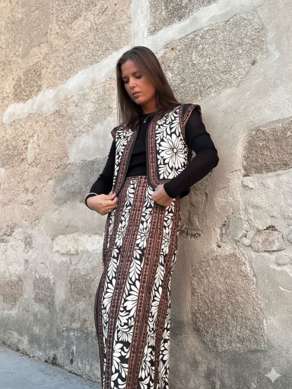 La falda Venecia es pura elegancia con un toque moderno. Confeccionada en un estampado especial de rayas en beige y negro, su diseño largo y fluido estiliza la silueta y aporta movimiento a cada paso. Versátil y atemporal, es perfecta para combinar con el chaleco Venecia en conjunto o lucir con tus básicos favoritos, creando looks sofisticados y únicos.