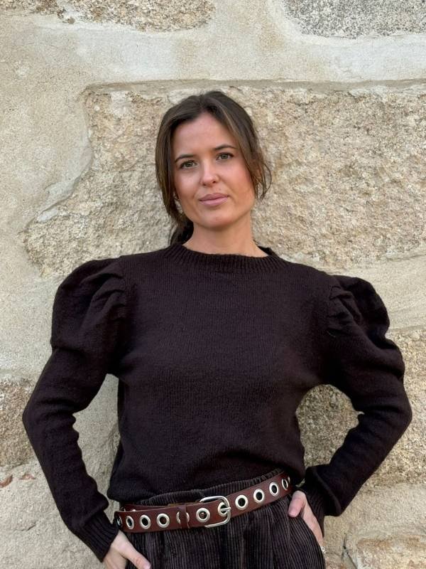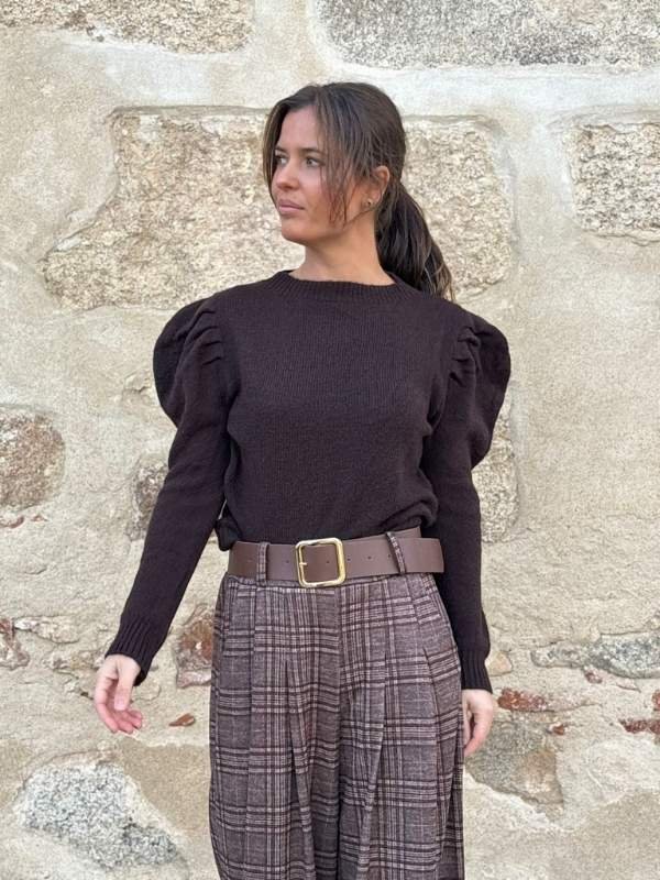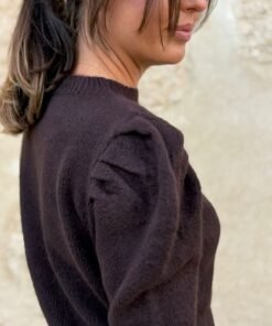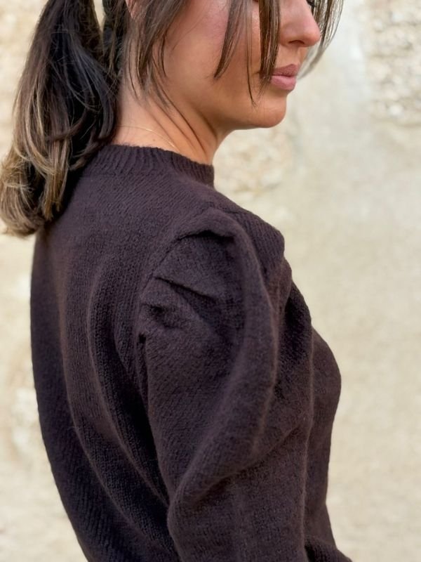 Jersey en marrón chocolate con frunces en los hombros. Suave, favorecedor y fácil de combinar. Un básico con presencia.
