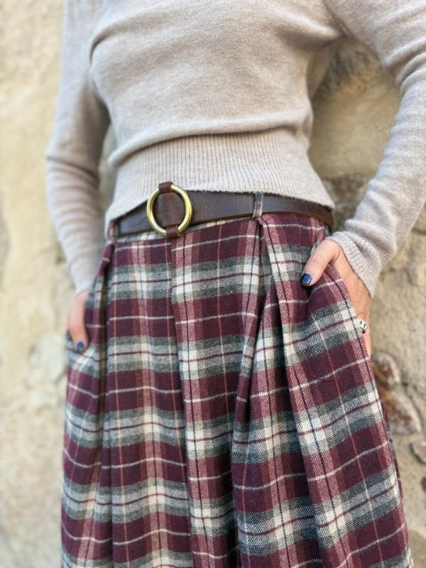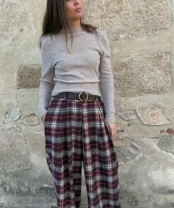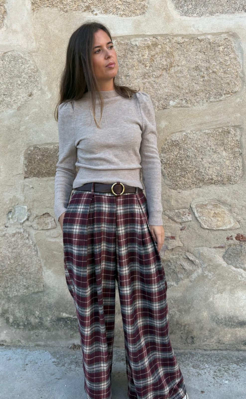 Palazzo de cuadros burdeos con toque de lana. Cálido, fluido y con estilo elegante.