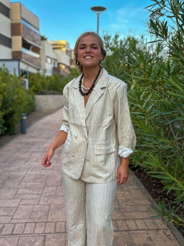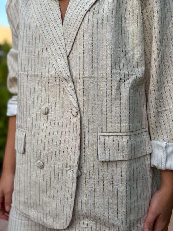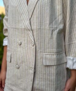 El Total Look Marina de ZEN es la propuesta ideal para quienes buscan sofisticación y frescura en un mismo conjunto. Confeccionado en tejido ligero de rayas finas, el traje combina una americana de doble botonadura con pantalón recto de tiro medio, logrando un equilibrio perfecto entre estilo formal y desenfadado.
