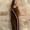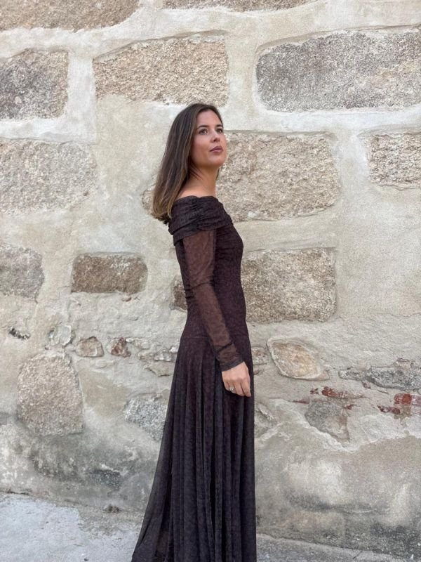 Vestido marrón de media manga con hombros al aire y estampado suave en tonos tierra. Femenino, cómodo y con estilo natural.