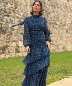Vestido de volantes de cuadros confeccionado en gasa ligera, con una caída suave y muy favorecedora. Su diseño destaca por los tres volantes en la falda, que aportan movimiento y feminidad, y por el nudo en el cuello, un detalle elegante que estiliza la silueta y realza la zona del escote.